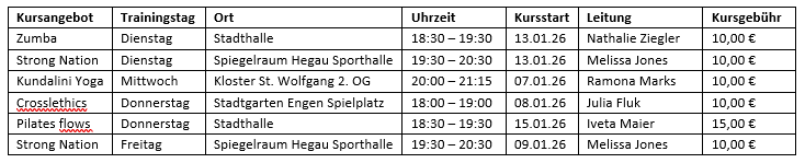 Der 1. Block in 2026 hat zum Teil vergangene Woche schon gestartet. Die Mindest-Teilnehmerzahl ist für fast alle Angebote erreicht. Für das Pilates am Dienstagabend, das Hatha Yoga am Mittwochmorgen sowie das Kundalini-Yoga um 18:30 Uhr am Mittwochabend sind leider keine Plätze mehr vorhanden.